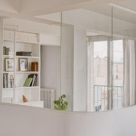 Les poutrelles apparentes en béton brut ont été mises en valeur par les hourdis peints en blanc, créant un jeu de contraste et de perspective et répondre aux contraintes économiques.